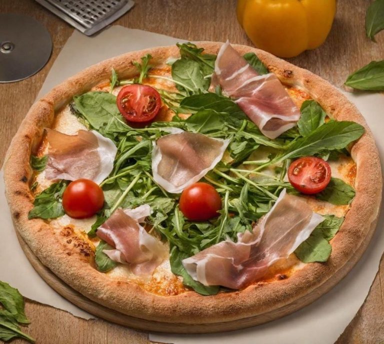 Knusprige Pizza aus dem Steinofen mit San Marzano Tomatensauce und Fior di Latte, belegt mit feinem Parmaschinken, frischem Rucola und gehobeltem Parmiggiano Reggiano.